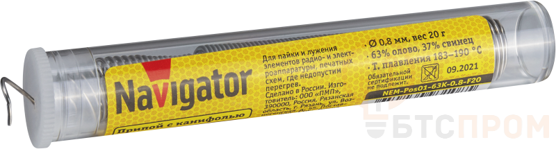 Припой NEM-Pos01-63K-0.8-F20 от бренда Navigator — это высококачественный оловянно-свинцовый сплав (ПОС-63), предназначенный для пайки ответственных соединений. Проволока диаметром 0.8 мм в прочной колбе массой 20 грамм оснащена флюсовым сердечником, что обеспечивает легкое плавление, отличную растекаемость и формирование блестящего, надежного шва.