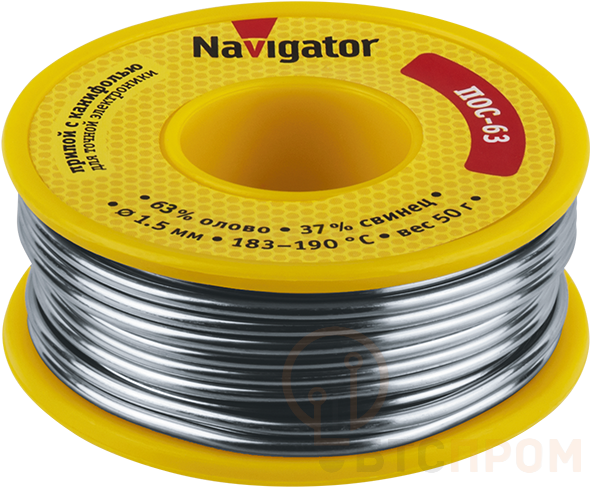 Припой NEM-Pos05-63K-1.5-K50 (ПОС-63) от бренда NAVIGATOR – это высококачественный оловянно-свинцовый сплав, предназначенный для надежного и долговечного монтажа радиоэлектронных компонентов. Сплав содержит 63% олова и 37% свинца, что обеспечивает низкую температуру плавления (около 183°C) и явление так называемого "эвтектического" плавления, предотвращающее переход в пастообразное состояние.