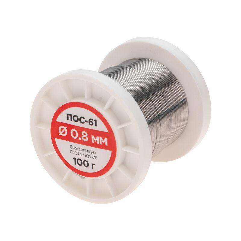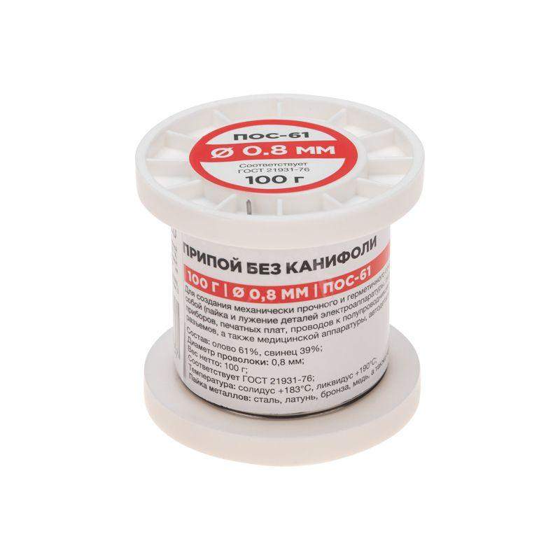 Припой в катушке ПОС-61 O0,8 мм (без канифоли) REXANT предназначен для создания механически прочного и герметичного соединения деталей между собой или для их фиксирования на плате (пайка и лужение радиоэлектронных приборов, медицинской аппаратуры, автодеталей, печатных плат, электроаппаратуры и т.д.). Представляет собой проволоку (диаметром 0,8 мм) из сплава олова (60 %) и свинца (40 %). Как действует припой: нагреваясь до определенной температуры (183...190 °C) он расплавляется, смачивает спаиваемый металл, растекается по нему, заполняя место между соединяемыми деталями. Припой ПОС-61 обладает такими свойствами, как устойчивость к коррозии, создание механической прочности спаянного соединения, обладание удельной проводимостью (для токоведущих элементов). Основные характеристики: Диаметр припоя: 0,8 мм; Состав: олово (60 %) и свинец (40 %) Срок годности: бессрочно.