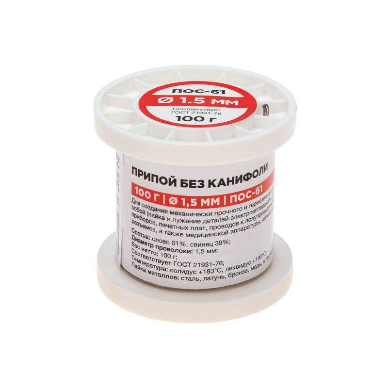 Припой в катушке ПОС-61 O1,5 мм (без канифоли) REXANT предназначен для создания механически прочного и герметичного соединения деталей между собой или для их фиксирования на плате (пайка и лужение радиоэлектронных приборов, медицинской аппаратуры, автодеталей, печатных плат, электроаппаратуры и т.д.). Представляет собой проволоку (диаметром 1,5 мм) из сплава олова (60 %) и свинца (40 %). Как действует припой: нагреваясь до определенной температуры (183...190 °C) он расплавляется, смачивает спаиваемый металл, растекается по нему, заполняя место между соединяемыми деталями. Припой ПОС-61 обладает такими свойствами, как устойчивость к коррозии, создание механической прочности спаянного соединения, обладание удельной проводимостью (для токоведущих элементов). Основные характеристики: Диаметр припоя: 1,5 мм Состав: олово (60 %) и свинец (40 %) Срок годности: бессрочно.