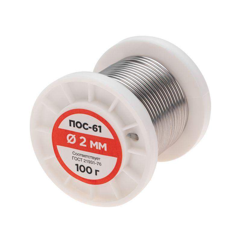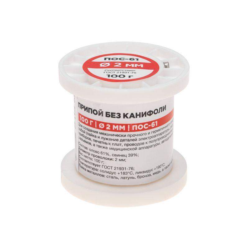 Припой в катушке ПОС-61 O2,0 мм (без канифоли) REXANT предназначен для создания механически прочного и герметичного соединения деталей между собой или для их фиксирования на плате (пайка и лужение радиоэлектронных приборов, медицинской аппаратуры, автодеталей, печатных плат, электроаппаратуры и т.д.). Представляет собой проволоку (диаметром 2,0 мм) из сплава олова (60 %) и свинца (40 %). Как действует припой: нагреваясь до определенной температуры (183...190 °C) он расплавляется, смачивает спаиваемый металл, растекается по нему, заполняя место между соединяемыми деталями. Припой ПОС-61 обладает такими свойствами, как устойчивость к коррозии, создание механической прочности спаянного соединения, обладание удельной проводимостью (для токоведущих элементов). Основные характеристики: Диаметр припоя: 2,0 мм Состав: олово (60 %) и свинец (40 %) Срок годности: бессрочно