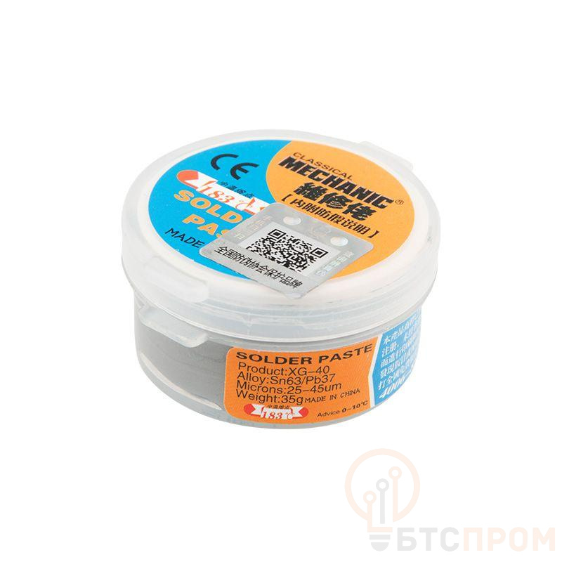 Припой — паста (паяльная паста) — это техническая (вязкая, густая) смесь порошкообразного припоя и флюса-связки, а также других вспомогательных веществ, которые делают свойства пасты более активными и интенсивными. Паяльные пасты широко используются в электронной промышленности в технологии поверхностного монтажа SMD компонентов. Служит материалом, обеспечивающим образование паяльных соединений. Способ применения: Нанести на место пайки. Произвести пайку. При необходимости удалить остатки. Основные достоинства: Многофункциональность применения — помимо основного назначения в качестве припоя, паста одновременно является флюсом. Возможность применения пасты для изготовления плат с очень мелкими деталями. Механизация паяльных работ. Технические характеристики: Температура пайки: 180...350 °C Содержание олова: 63 % Тип флюса: канифольный активный Отмывка: горячая вода Масса: 35 г