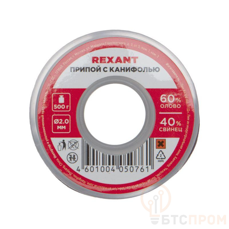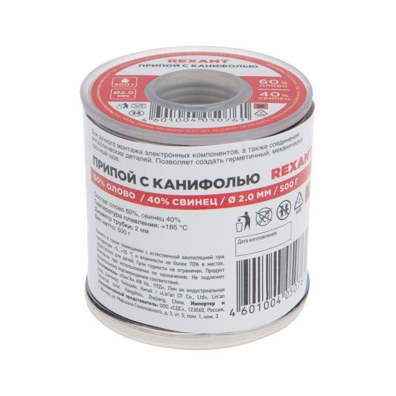 Припой с канифолью REXANT представляет собой проволоку (диаметром 2 мм) из сплава олова (60 %) и свинца (40 %). Используется в пайке для соединения деталей между собой и позволяет создать герметичный, механически прочный (устойчивый) шов. Нагреваясь до температуры плавления (183...188 °C) припой: расплавляется, смачивает спаиваемый металл и, растекаясь по нему — заполняет место между соединяемыми деталями.
