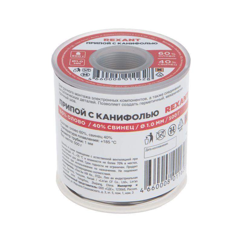 Припой с канифолью REXANT представляет собой проволоку (диаметром 1 мм) из сплава олова (60 %) и свинца (40 %). Используется в пайке для соединения деталей между собой и позволяет создать герметичный, механически прочный (устойчивый) шов. Нагреваясь до температуры плавления (183...188 °C) припой: расплавляется, смачивает спаиваемый металл и, растекаясь по нему — заполняет место между соединяемыми деталями. В свою очередь флюс канифольный активный (MC-20A) помогает сделать паянное соединение более прочным! Убирая окислительную плёнку со спаиваемых поверхностей и защищая их от дальнейшего окисления при пайке. Содержание флюса в припое — 2,2 %. Как видно из вышесказанного припой с канифолью REXANT — самое что ни на есть «два в одном»: припой и флюс на катушках по 500 грамм.