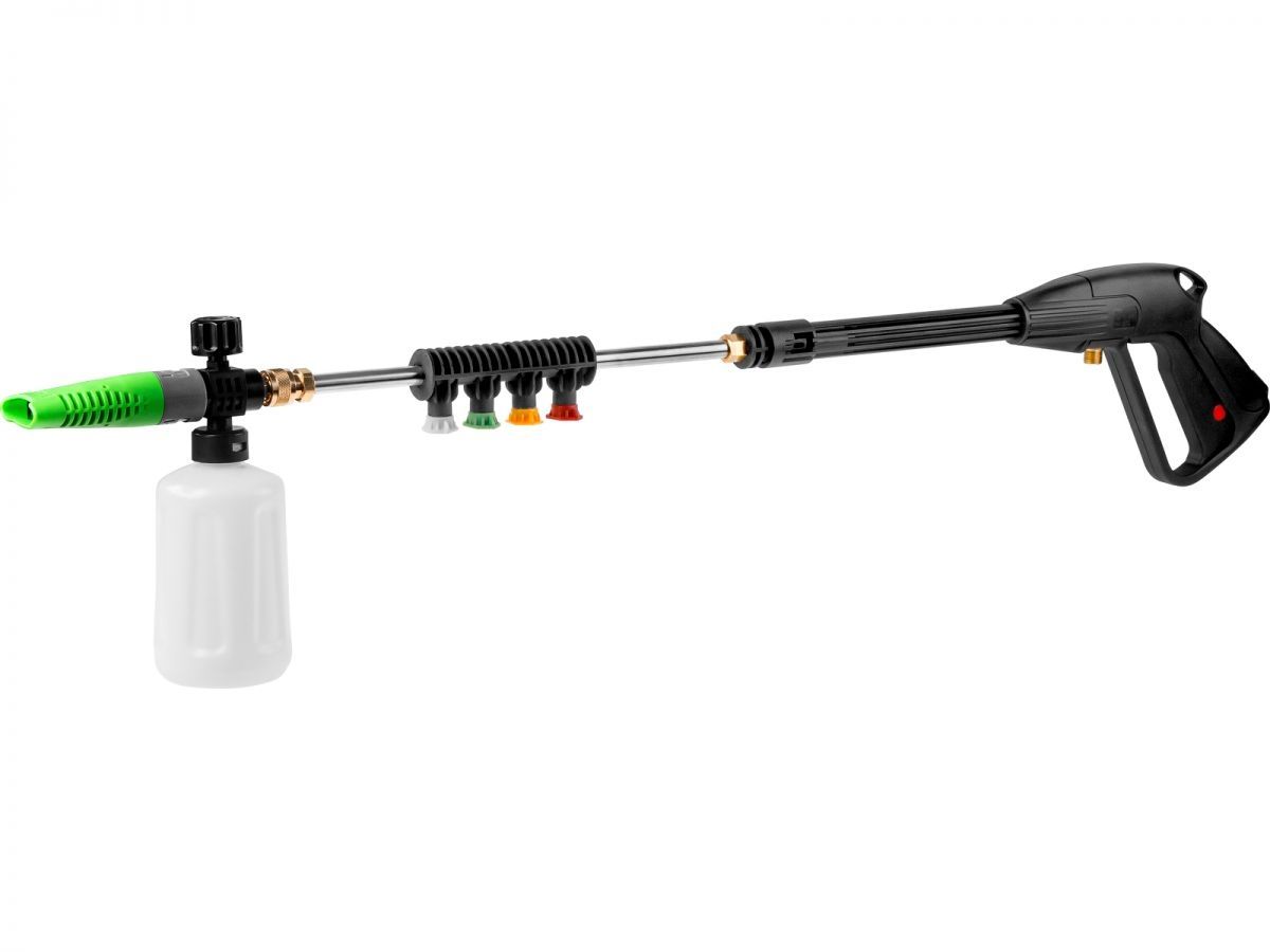 В комплект поставки входит пеногенератор, грязевая фреза для удаления стойких загрязнений, 4 веерных сопла под различные нужды, фильтр тонкой очистки.
