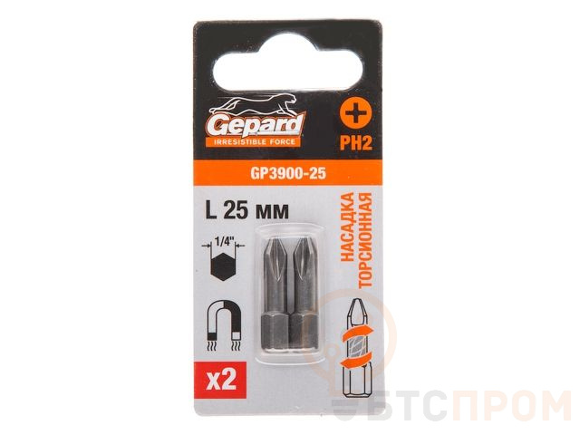 Насадка крестообразная PH2 25мм 2шт торсионная GEPARD (GP3900-25) (бита Phillips сталь S2 магнитная) GP3900-25