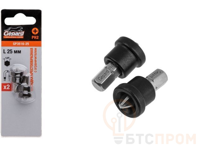 Насадка крестообразная PH2 25мм с ограничителем 2шт. GEPARD (GP3516-25) (бита Phillips для ГКЛ сталь S2 магнитная) GP3516-25