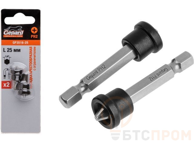 Насадка крестообразная PH2 50мм с ограничителем 2шт. GEPARD (GP3516-50) (бита Phillips для ГКЛ сталь S2 магнитная) GP3516-50