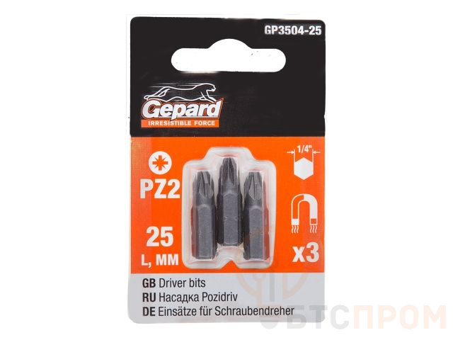 Насадка крестообразная PZ2 25мм 3шт GEPARD (GP3504-25) (бита Pozidrive позидрив сталь S2 магнитная) GP3504-25