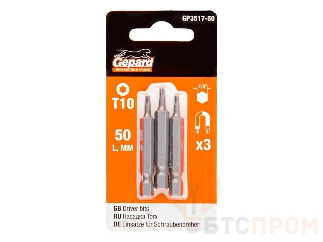 Насадка TORX T10 50мм 3шт GEPARD (GP3517-50) (бита звездочка шестилучевая звезда сталь S2 магнитная) GP3517-50