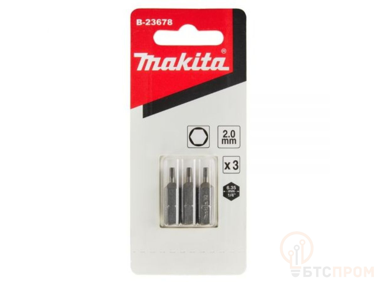 Бита HEX2.0, 25 мм, C-form, 3 штуки, Makita B-23678. Биты Makita шестигранник для выполнения монтажных и демонтажных работ. Применяется совместно с шуруповертом для завинчивания шурупов с внутренним шестигранником. Набор бит Makita представляют собой стержень шестигранной формы, с одной стороны которого располагается рабочий профиль, а вторая сторона выступает хвостиком, который обеспечивает надежную фиксацию биты в патроне инструмента. Применяются для винтовых работ с высокими, а также резко возрастающими моментами вращения, например, при креплении металлических деталей на дерево, или винтов с метрической резьбой. Незаменимый инструмент на автосервисе, при ремонте автомобилей, для слесарных работ, при ремонте двигателей. Изготовлены из высококачественной стали обладающей необходимой прочностью.