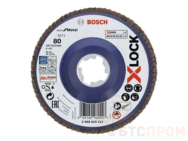 Круг лепестковый 125х22.2 мм G80 плоский BEST FOR METAL X-LOCK BOSCH 2608619211 фото в каталоге от BTSprom.by