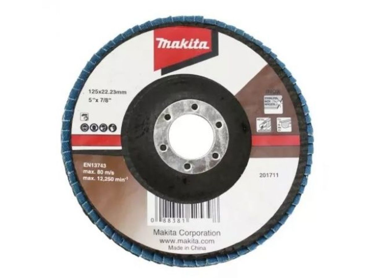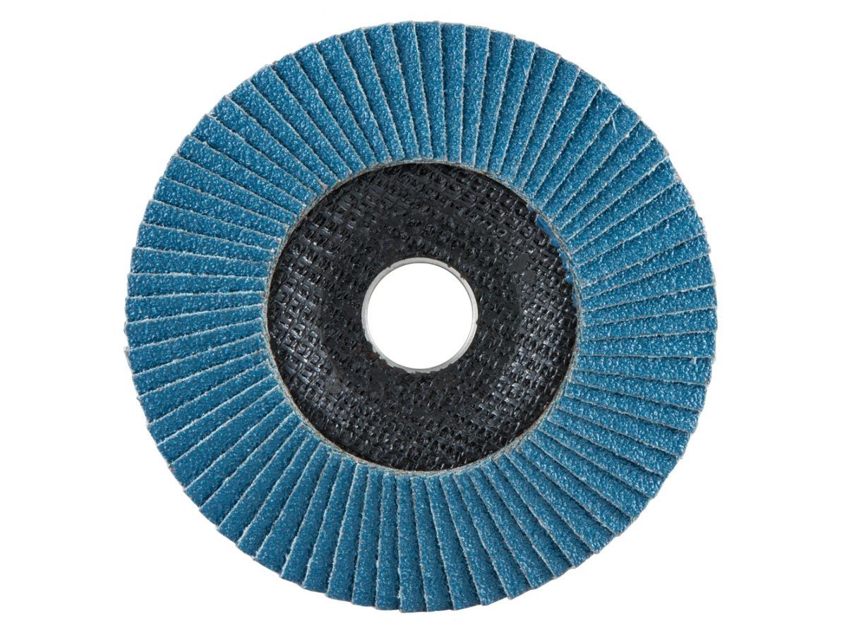 Диск лепестковый шлифовальный 125x22.23 мм, Z80, стекловолокно, угловой Makita D-63806. Благодаря циркониевому корунду, а так же отсутствию оксида железа в составе диск отлично подходит для работ по нержавеющей стали и металлу. Обладает повышенной износостойкостью и отлично справляется со снятием заусенцев, удалением следов побежалости, ржавчины и краски.