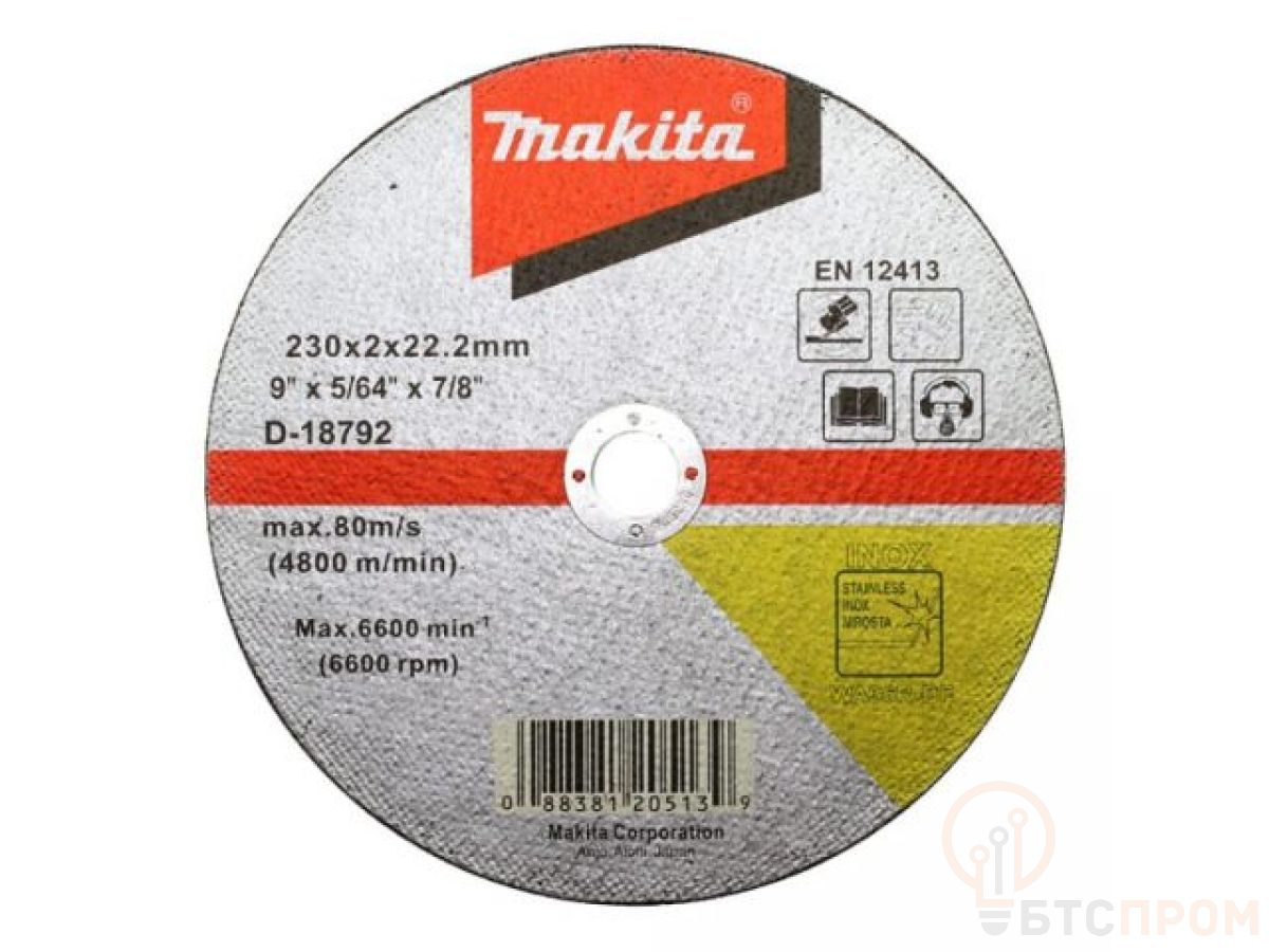 Отрезной абразивный диск Makita D-18792 используется в угловых шлифовальных машинах для работы по нержавеющей стали. Оснастка имеет твердость - 60.