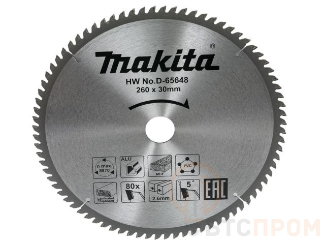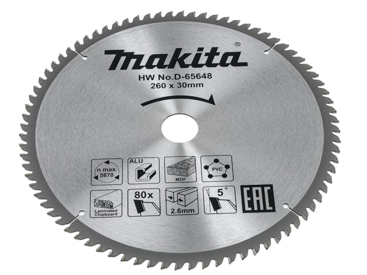 Пильный диск универсальный, STANDART, 260x30x2.6x80T, Makita D-65648. Диск Makita D-65648 предназначен для резки дерева, алюминия, МДФ, ПВХ, ДСП. Специальная форма зуба (TCG) обеспечивает качественный ровный распил. Благодаря особой форме зубов обеспечивается высокая производительность и надежность работы. Пильные диски выполнены из высококачественных материалов и имеют длительный срок службы. Характеризуется высокой износостойкостью и долговечностью. Оптимальный диаметр диска позволяет использовать его наиболее эффективно. В качестве дополнительного плюса можно отметить тот факт, что диск можно легко установить в инструмент.