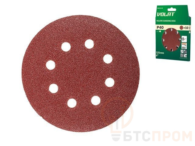 Шлифлист 125мм круг Р 40 д/дерева 8 отв. 10шт. ВОЛАТ (круг абразивный шлифовальный перфорированный) 80010-40