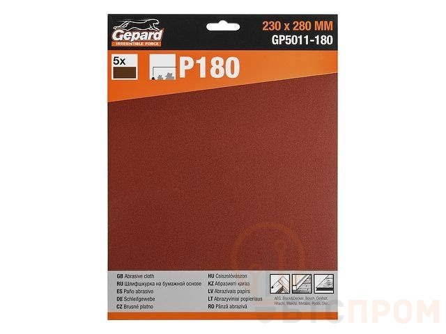 Шлифлист 230х280мм Р180 бум.осн. 5шт. GEPARD (GP5011-180) (бумага наждачная абразивная, лист шлифовальный абразивный, шлифшкурка) GP5011-180