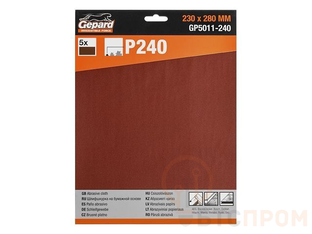 Шлифлист 230х280мм Р240 бум.осн. 5шт. GEPARD (GP5011-240) (бумага наждачная абразивная, лист шлифовальный абразивный, шлифшкурка) GP5011-240
