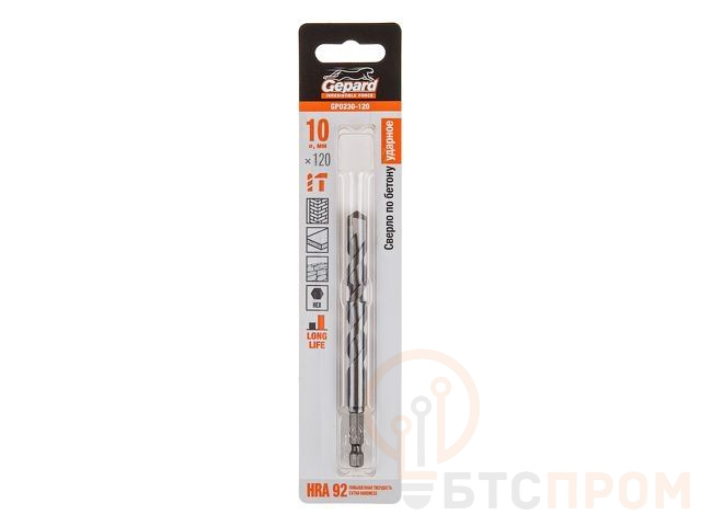 Сверло по бетону 10х120мм шестигр. GEPARD (GP0230-120) (усиленная пластина, Impact, победитовое ударное) GP0230-120