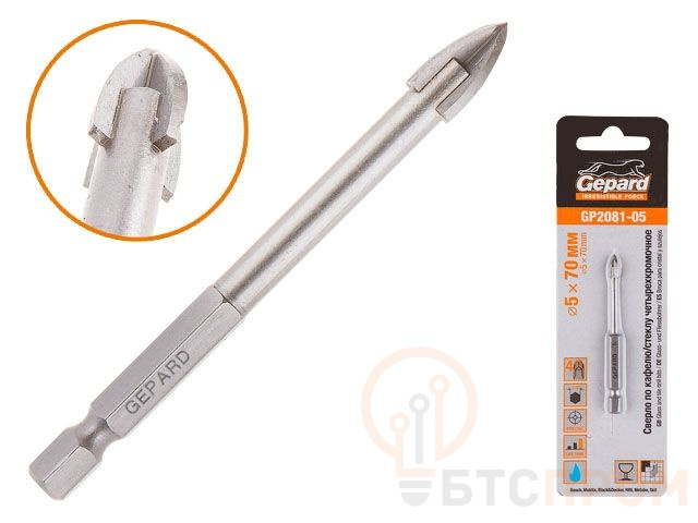 Сверло по кафелю/стеклу 5х70мм четырехкромочное шестигр. GEPARD (GP2081-05) (Impact, по керамической плитке, крестовая пластина) GP2081-05
