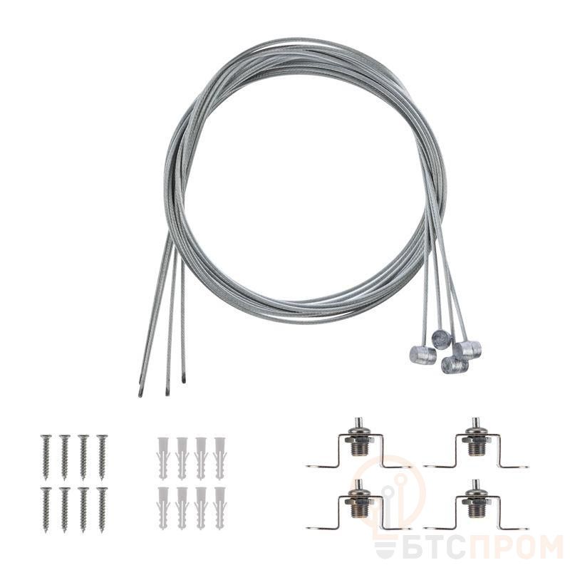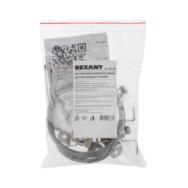 Комплект подвесных крепежей для светодиодных панелей № 1 (Трос длиной 1м - 4 шт.; Винт самонарезающий 4х25 - 8 шт.; Дюбель пластмассовый 6х30 - 8 шт. Rexant 606-301