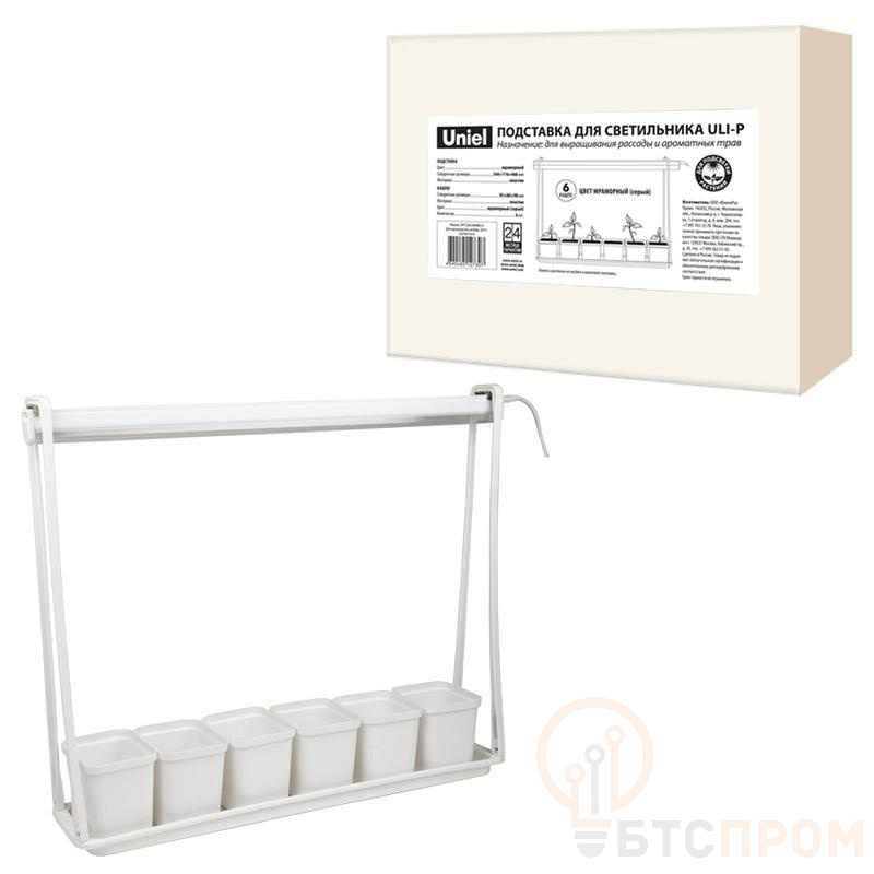 Пластиковая легкая подставка с набором из 6 кашпо UFP-G56S MARBLE 6 для крепления линейных фитосветильников Uniel серии ULI-P - удобный бюджетный вариант для выращивания рассады и ароматных трав. Обратите внимание, что светильник для растений необходимо приобретать отдельно! Конструкцию легко собрать, все необходимое есть в наборе. В собранном варианте подставка не занимает много места. В наборе идут 6 горшочков для рассады со специальной вставкой на дне, благодаря которой растения легко пересаживать. Благодаря лаконичному внешнему виду подставка для светильников органично впишется в любой интерьер. Её можно установить на любую плоскую поверхность: стол, пол или подоконник. Легкая, весит всего 650 грамм с упаковкой. Гарантия от производителя 2 года. Страна производства Россия.