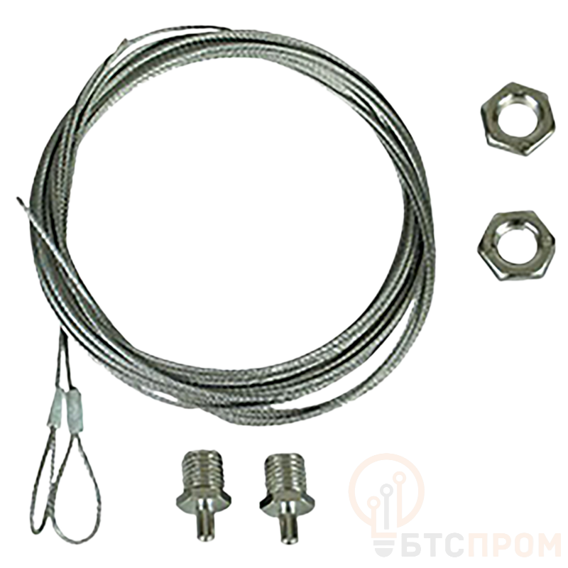 Конструкция подвеса выполнена из высококачественной оцинкованной стали, что обеспечивает устойчивость к коррозии и длительный срок службы. Основой служит прочный стальной трос диаметром 2 мм, снабженный комплектом крепежных элементов: стальными наконечниками, пружинной зажимной муфтой и латунной штампованной гильзой для надежной фиксации. Длина изделия составляет 1000 мм, что позволяет использовать его для монтажа на различных высотах.