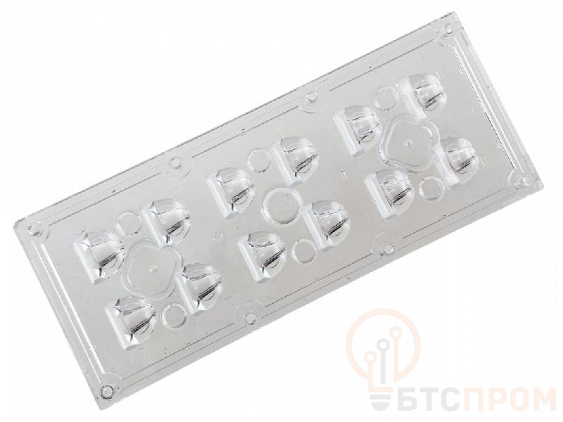 Оптика оснащена двумя монтажными отверстиями под светодиоды (2x6-Dk) и посадочным местом для уплотнителя Аргос-5371, что гарантирует высокую степень пыле- и влагозащиты (IP). Корпус выполнен из термостойкого оптического полимера (TPII), устойчивого к пожелтению и деформации. Основная сфера применения — уличное, архитектурное и промышленное освещение, где требуется точный контроль светового пучка для освещения фасадов, пешеходных зон, автотрасс и территорий предприятий.