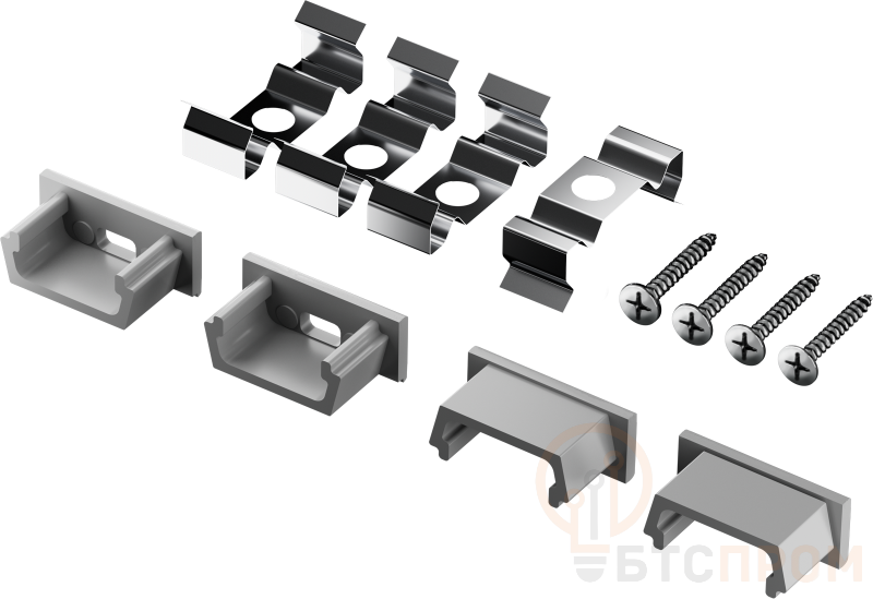Описание. Монтажный комплект содержит все необходимое для установки светодиодной ленты на поверхность: стальные клипсы для крепления профиля, пластиковые_x000D_ заглушки и саморезы. Состав комплекта. Заглушки – 4 шт., клипсы – 4 шт., саморезы – 4 шт.