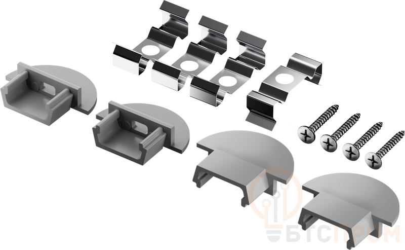 Описание. Монтажный комплект содержит все необходимое для установки светодиодной ленты на поверхность: стальные клипсы для крепления профиля, пластиковые_x000D_ заглушки и саморезы. Состав комплекта. Заглушки – 4 шт., клипсы – 4 шт., саморезы – 4 шт.