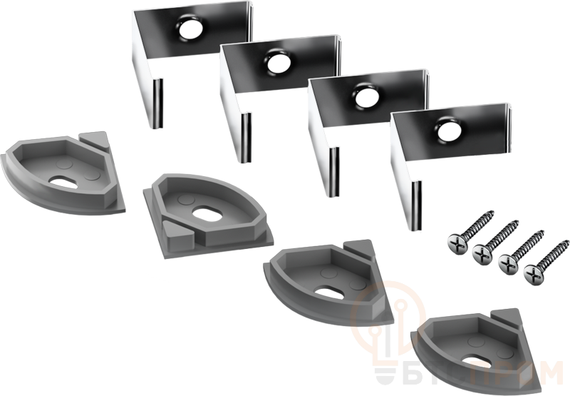 Описание. Монтажный комплект содержит все необходимое для установки светодиодной ленты на поверхность: стальные клипсы для крепления профиля, пластиковые_x000D_ заглушки и саморезы. Состав комплекта. Заглушки – 4 шт., клипсы – 4 шт., саморезы – 4 шт.