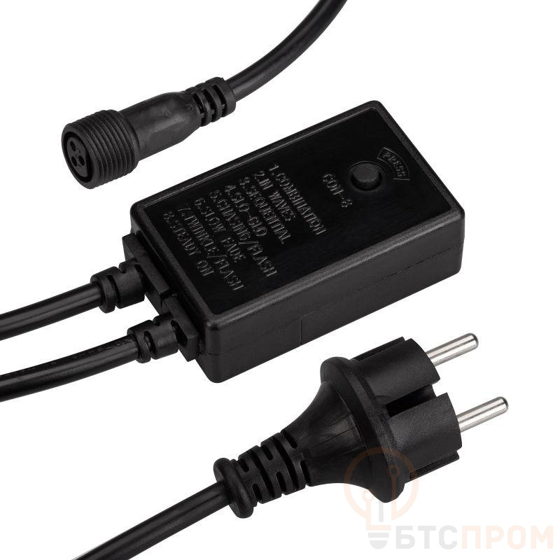 Контроллер для светодиодных гирлянд с эффектом динамики. Материал оболочки РЕЗИНА (каучук). Цвет провода чёрный. В комплект входит: провод питания с вилкой европейского стандарта (IP44), 3pin разъём подключения к гирлянде, выпрямитель AC/DC (1.6A), контроллер для смены режимов динамического свечения (8 режимов). Длина провода 1.5 метра.