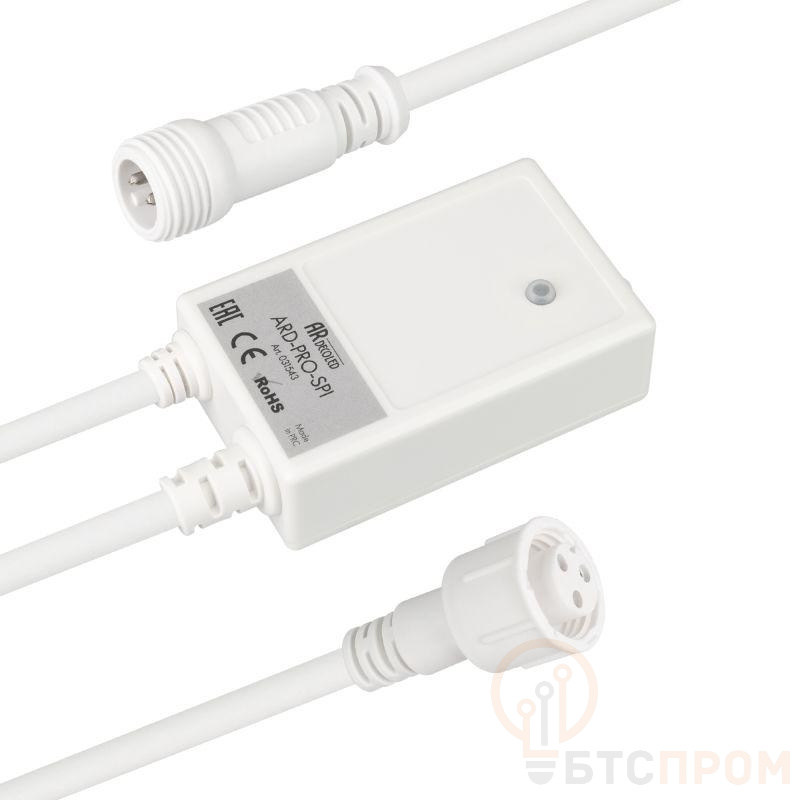 SPI контроллер для управления гирляндами серии RGB-SPI и синхронизации их работы. Напряжение питания DC 12V, максимальная нагрузка 80Вт. максимальное число поддерживаемых пикселей 120pix, коннекторы male/female. Для подключения к сети необходим блок питания. Управление динамическими и статическими режимами свечения с помощью кнопки на корпусе. Поддерживаемый тип микросхемы SPI (2903/2811). Габариты 80x50x25 мм.
