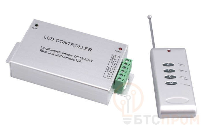 Контроллеры для RGB-ленты с пультом управления предназначены для управления светодиодной лентой. Можно менять цвета свечения ленты, задавая любые. Можно программировать контроллер, задавая частоту смены цветов свечения ленты, можно достичь плавной смены цветов или сделать ее резкой, добавить мерцание или использовать другие интересные функции. Тип управляещего сигнала контроллера : радиочастотный. Используется радиосигнал. Это позволяет устанавли- вать контроллеры за какие-либо препятствия, будь то гипсокартон или что-нибудь еще. Дальность действия такого контроллера составляет 50 м. При наличии в комнате 2 и более контроллеров команды с пульта управления будут передаваться одновременно.
