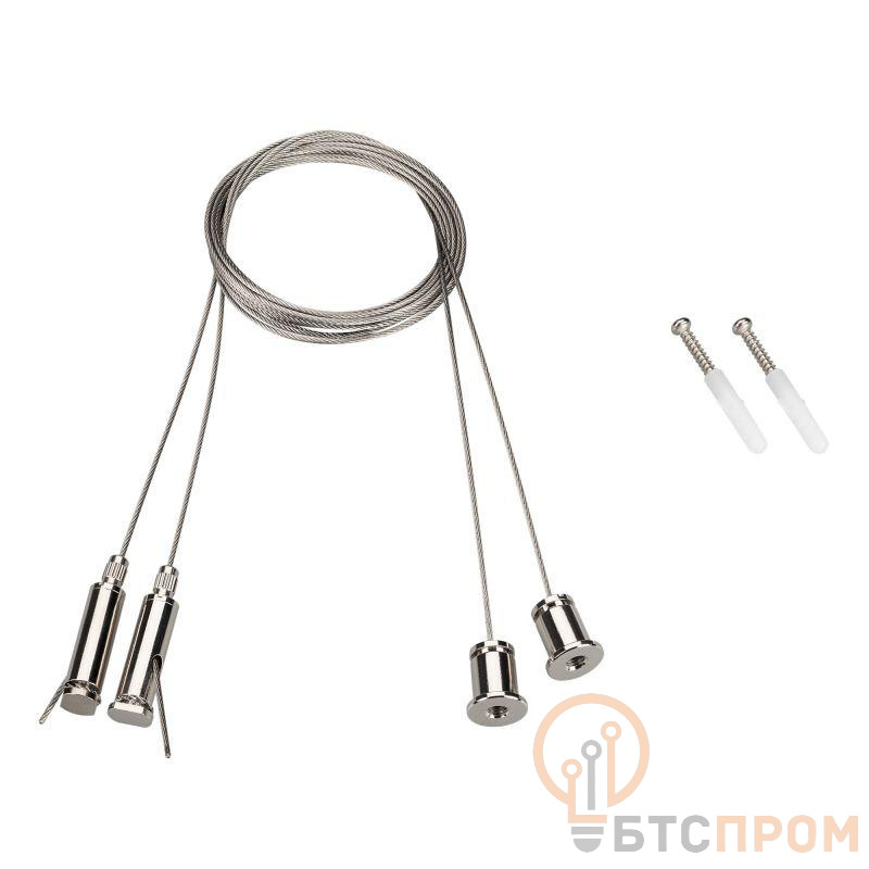 Подвес для профилей SL-COMFORT. Цвет - серебристый. В комплекте: трос 2 м - 2 шт., шуруп с дюбелем - 2 шт. Максимальная нагрузка на 1 трос 7 кг. Цена за комплект.