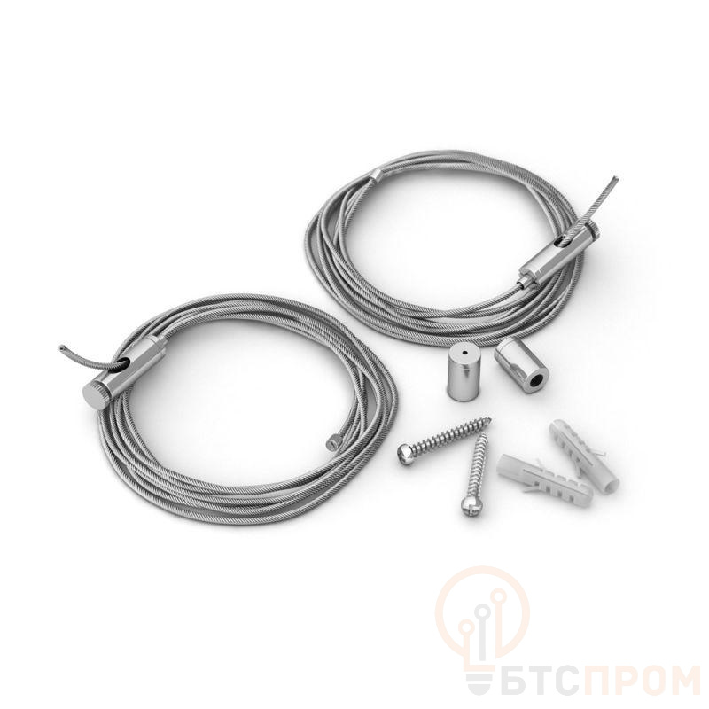 Подвес для профилей SL-LINE-5035, SL-LINE-6070, SL-LINE-7532. Цвет - серебристый. В комплекте: трос 2,5 м - 2 шт., шуруп с дюбелем - 2 шт. Максимальная нагрузка на 1 трос 7 кг. Цена за комплект.
