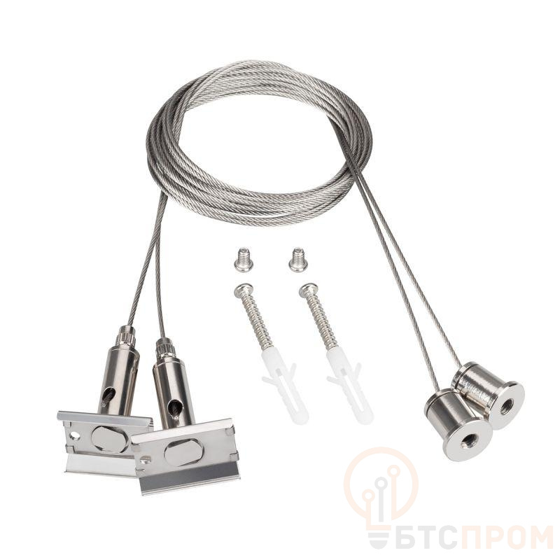 Подвес для профилей SL-LINE-4050-3L. Цвет - серебристый. В комплекте: трос 2 м - 2 шт. (винт с площадкой 9х12х2мм), держатель - 2 шт., шуруп с дюбелем - 2 шт., шайба гровер - 2 шт., винт для установки держателя - 2 шт. Максимальная нагрузка на 1 трос 7 кг. Цена за комплект.