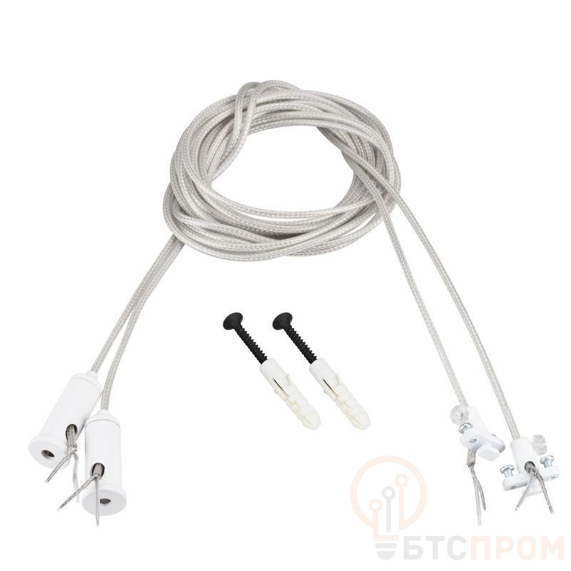 Токопроводящий подвес серии ARL белого цвета для профилей SL-LINE-3535, 5050, 3667, 3691, 4932, 5050, 4970, 7477, 2011М, SL-ARC-3535. В комплекте: трос 2 м с токопроводящим медным сечением - 2 шт. (сечение кабеля - 2х0,5 мм2), тросовый держатель - 2 шт., фиксатор для троса - 2 шт., винт крепежный металлический - 4 шт., винт крепежный из поликарбоната прозрачный - 2 шт., шуруп - 2 шт., дюбель - 2 шт. Максимальная нагрузка на один трос 4 кг. Падение напряжения на 1 м - 0,1 V. Максимальное напряжение нагрузки – 250 V. Максимальный ток нагрузки – 2 А. Цена за комплект.