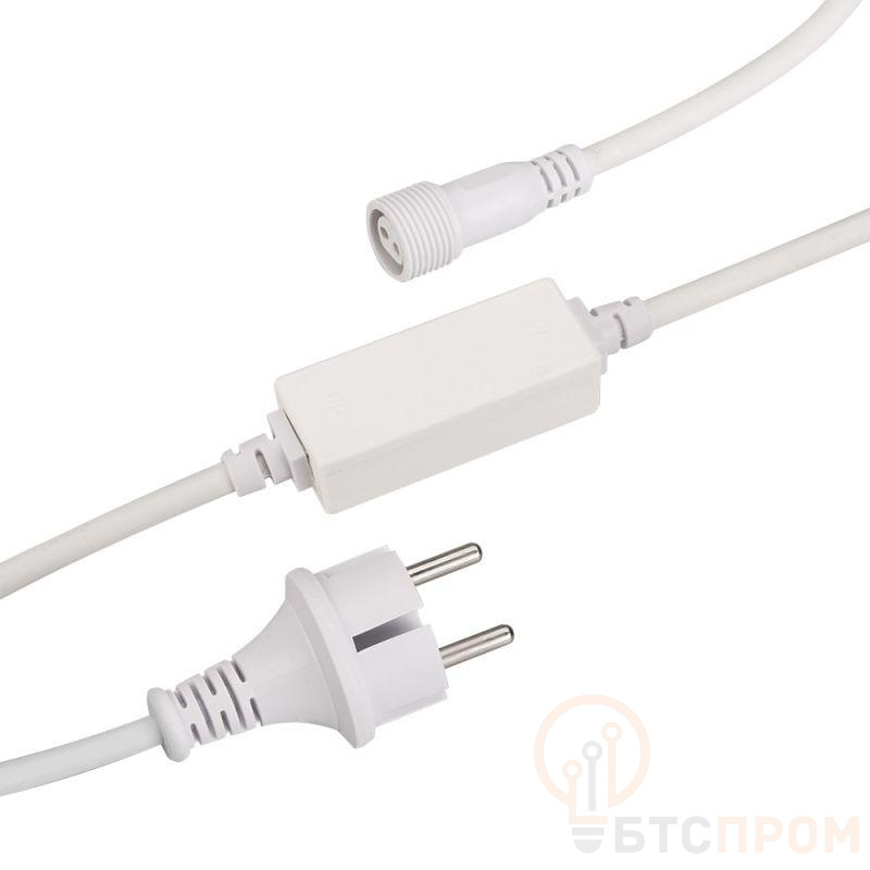 Шнур питания для светодиодных гирлянд постоянного свечения. Материал оболочки ПВХ. Цвет провода белый. В комплект входит: шнур питания с вилкой европейского стандарта (IP44), 2pin разъём подключения к гирлянде, выпрямитель AC/DC (1.6A). Длина провода 1.5 метра.