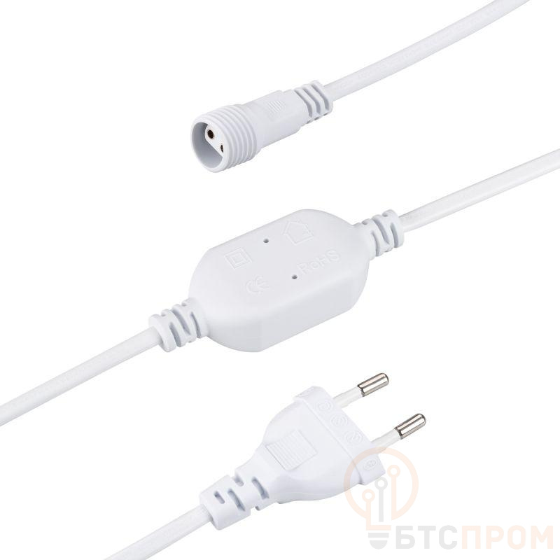 Шнур питания для светодиодных гирлянд с эффектом мерцания. Материал оболочки ПВХ. Цвет провода белый. В комплект входит: шнур питания с вилкой европейского стандарта (IP44), 2pin разъём подключения к гирлянде, выпрямитель AC/DC (1.6A). Длина провода 1.5 метра.