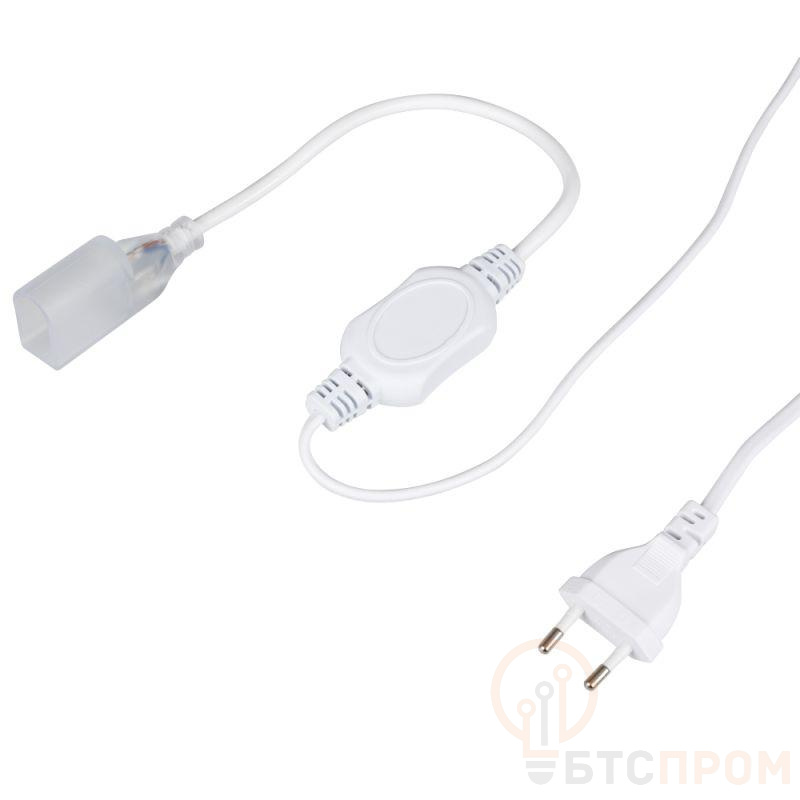 Коннектор питания с сетевой вилкой для подключения гибкого неона сечением 26х15 мм с напряжением питания DC230V (встроенный диодный мост AC-DC 230V). Длина провода 1200 мм, 2 коннектора подключения (одноцветный неон). Укомплектован силовым коннектором, заглушкой, клипсой держателем длиной 50 мм и 2 саморезами. Максимальная длина подключаемого неона не более 50 м.