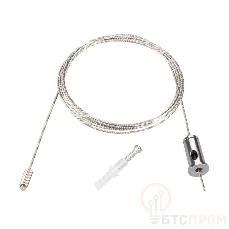 Подвес для профиля ROUND-D20. Цвет - серебристый. В комплекте: трос 2 м - 1 шт., шуруп с дюбелем - 1 шт. Максимальная нагрузка на 1 трос 10 кг. Цена за комплект из одного троса.