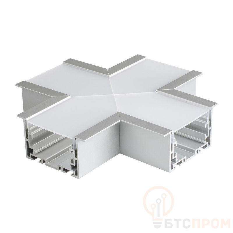 Крестовой угол в сборе, для соединения 4-х профилей S2-LINIA69-F под прямыми углами 90°. Экран образует линию "Х" на плоскости. В комплекте матовый экран, соединители. Размеры 150х150мм.