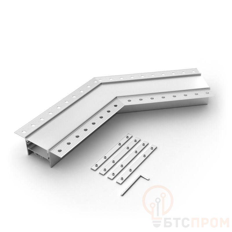 Под заказ от 4 шт. Угол в сборе, для профиля SL-LINIA45-FANTOM. Угол 135°. В комплекте угол с экраном, соединители, винты, шестигранный ключ.
