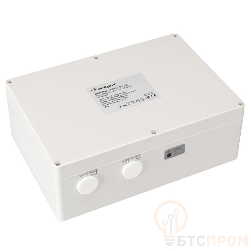 Блок аварийного питания с гальванической развязкой для группы светильников. Входное напряжение 220-240 VAC. Выходное напряжение: 230-300 VDC (подстраивается под блок питания). Допустимая мощность нагрузки: 100Вт. Встроенный PFC, PF>0,95. Герметичный пластиковый корпус со встроенной аккумуляторной батареей LiFePO4 IP 65. Ёмкость батареи 12000 мАч, напряжение 19.2В, максимальная мощность БАПа в режиме заряда 120Вт, время работы от АКБ от 1 ч в зависимости от нагрузки. Габаритные размеры блока питания длина 263 мм, ширина 182 мм, высота 95мм. Гарантийный срок 3 года.