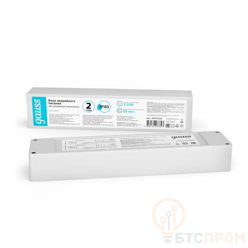 Блок аварийного питания IP40 205х42х28мм 20Вт на 1 час Universal GAUSS 997911024 фото в каталоге от BTSprom.by
