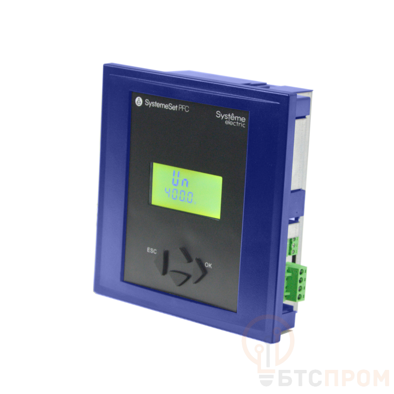 Контроллер коррекции коэффициента мощности торговой марки Systeme Electric cерии SystemeSet типа PFC необходим для измерения величины реактивной мощности и управления подключением/отключением ступеней регулирования УКРМ для обеспечения желаемого коэффициента мощности. Для компенсации реактивной мощности при разных нагрузках контроллер отслеживает активную и реактивную составляющую мощности путём измерения мгновенных значений напряжения и тока в электрической сети. На основе полученных данных вычисляется фазовый сдвиг между током и напряжением, полученное значение сравнивается с предварительно заданной величиной Cos ?. В зависимости от фактического отклонения коэффициента мощности контроллер подаёт команду на управление ступенями конденсаторных батарей. Напряжение 90-550В; ток 5мА-5А; 12 релейных выводов.