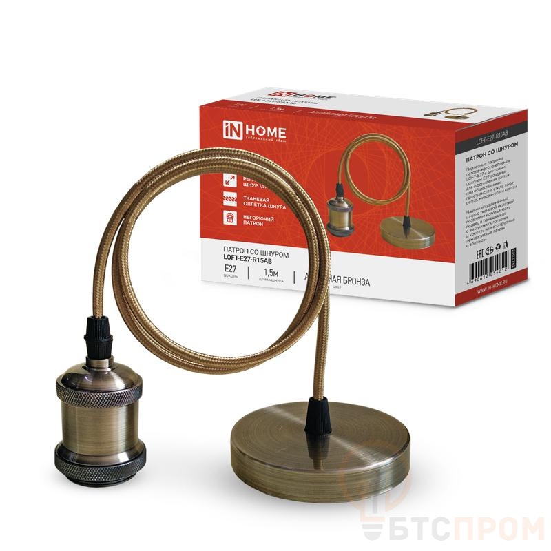 Патрон LOFT-Е27-R15AB со шнуром 1.5м античная бронза IN HOME 4690612054612 фото в каталоге от BTSprom.by