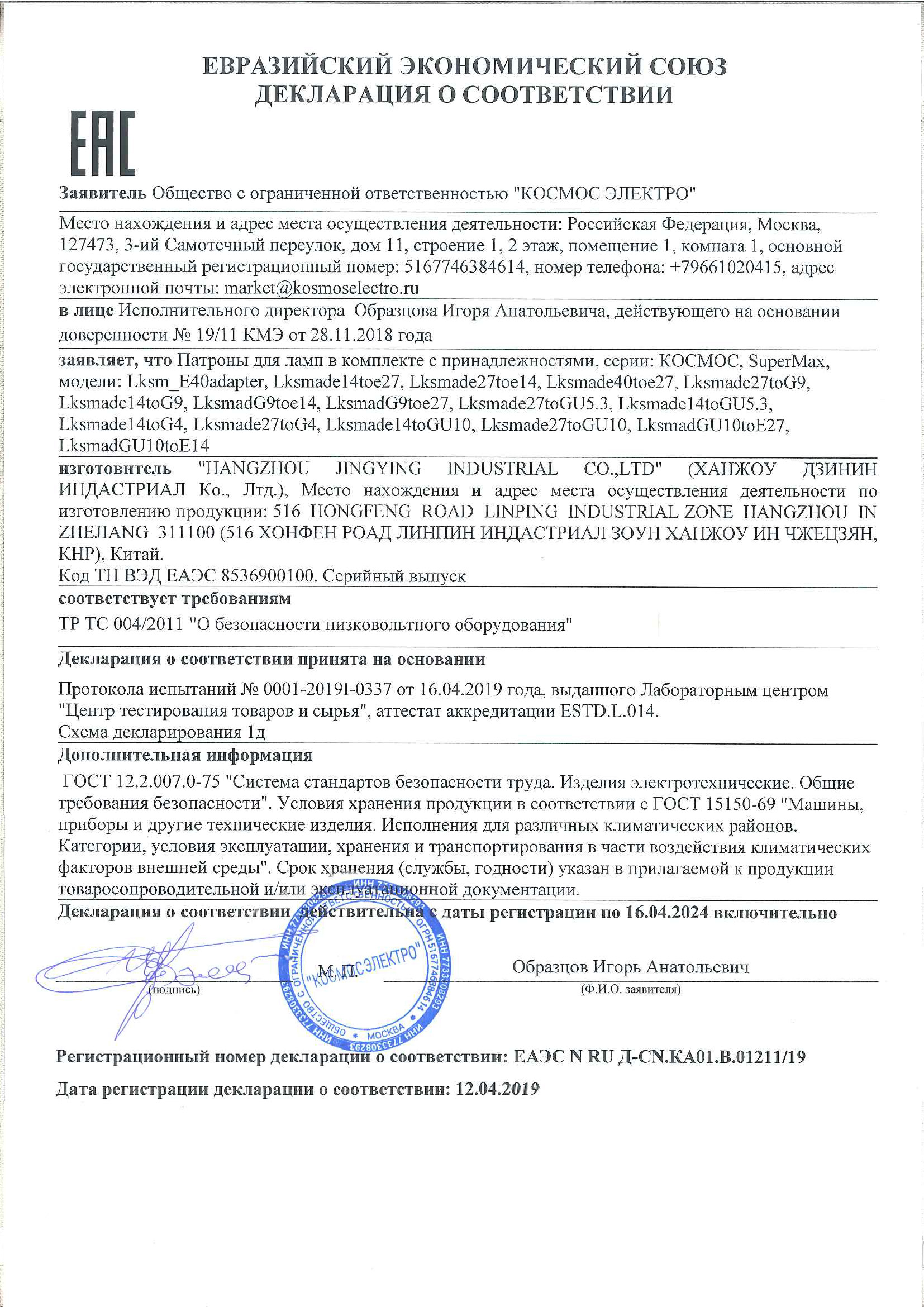 Переходник для ламп с цоколем E40 на цоколь E27 Космос Lksmade40toe27 представляет собой ламповый патрон-адаптер. Применяется для использования ламп с цоколем Е40 на патроне меньшего размера (Е27).