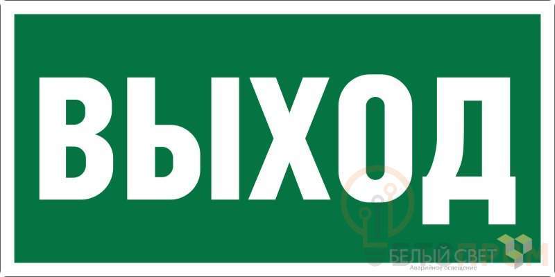 Знак безопасности "Выход", габаритные размеры 200х100 мм, фактические размеры 200х100 мм, сигнальный цвет - зеленый, контрастный цвет - белый